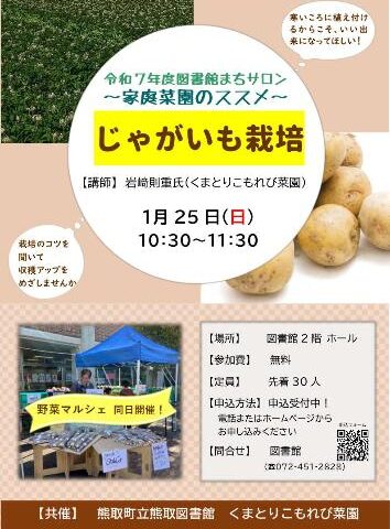 寒い時期の植え付けが出来を左右するとされる「じゃがいも栽培」をテーマにした、1月のまちサロンが1月25日(日)に熊取図書館で開催されます。講師は、くまとりこもれび菜園の岩崎則重さん。栽培の基本や収穫量を高めるポイントを学べる内容です。