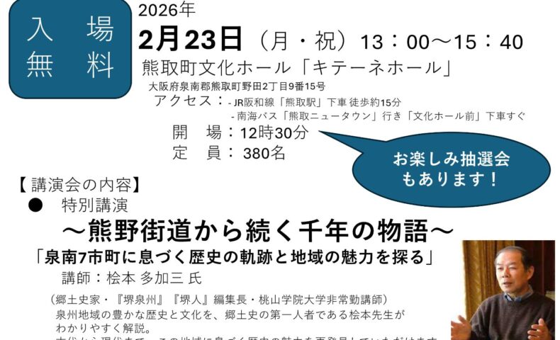 当日は、郷土史家で「堺泉州」「堺人」編集長、桃山学院大学非常勤講師の桧本多加三氏による特別講演「熊野街道から続く千年の物語~泉南7市町に息づく歴史の軌跡と地域の魅力を探る~」が行われる。