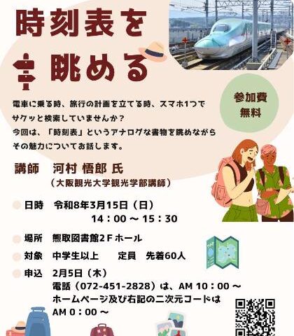 スマートフォンで簡単に検索できる時代だからこそ、あえて「アナログな時刻表」を眺める楽しさをテーマにした文化講演会が、3月15日(日)、熊取図書館で開催されます。