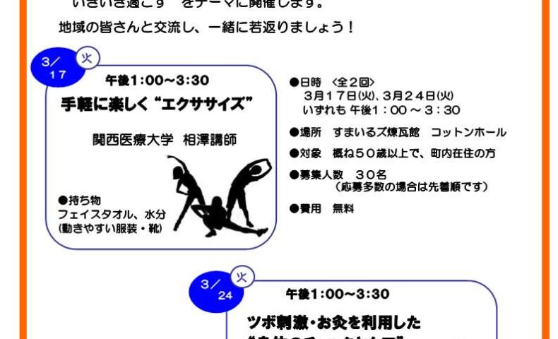 「これから何をしようか」と考えるおおむね50歳以上の町民を対象に、地域活動講座が開かれます。関西医療大学の講師・教授を迎え、運動や身体ケアを学ぶ全2回の連続講座です。