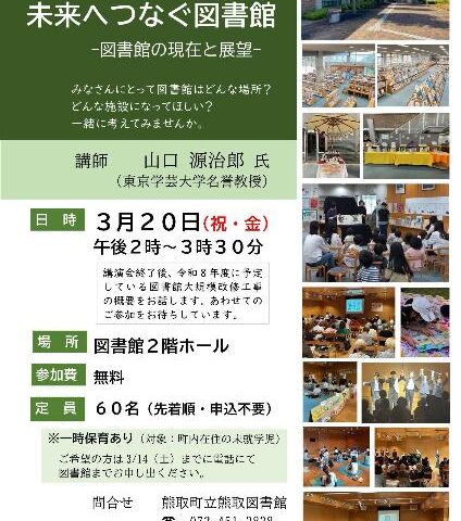 熊取図書館で3月20日(祝・金)、講演会「未来へつなぐ図書館」が開催されます。図書館の現在とこれからの姿について考える機会となり、終了後には令和8年度予定の大規模改修工事の概要説明も行われます。
