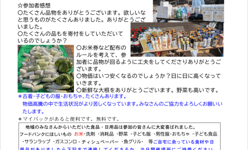 この取り組みは「すべての人に、食べ物を」をスローガンに実施されている地域支援活動で、誰でも参加可能。配布物はなくなり次第終了となります。
