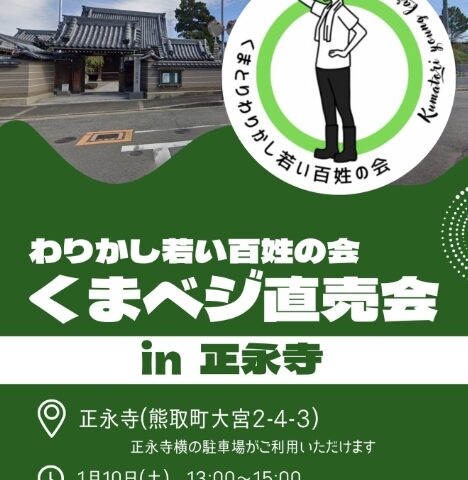 熊取町大宮の正永寺で、1月10日(土)13時から15時まで「くまベジ直売会」が開催されます。わりかし若い百姓の会による毎年恒例の出張直売所で、新鮮な野菜を販売。大森神社の十日戎参拝の際に立ち寄れるイベントです。